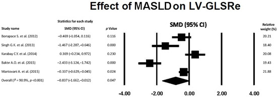 The forest plot showing the effect of MASLD on LV-GLSRe, assessed by the included studies, is illustrated in Figure 6.