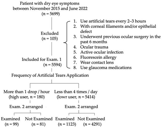The study protocol adhered to the Declaration of Helsinki and was approved by the Institutional Review Board. Patient consent was waived because this was a retrospective study involving low-risk patients. A total of 5699 patients were included, all of whom visited the outpatient clinic of one tertiary hospital for dry eye evaluation between November 2015 and June 2022. The included patients (n = 5594) were aged 20 years or older. The exclusion criteria are summarized in Figure 1 (n = 105). Within the cohort, 180 patients were identified as high users, defined as those using artificial tears at least once per hour, whereas 5414 patients were classified as low users, defined as those using artificial tears no more than four times daily (Figure 1). To minimize the confounding effects of topical gels/ointments, the treatments were discontinued for at least 1 day before comprehensive dry eye examinations [12], which were conducted within 1 week of visiting our dry eye clinic. The high users were asked to limit artificial tears to less than 4 times per day. Those high users who experienced intolerable eye pain were instructed to patch the lid closed in one eye alternately for 4 h for a duration of 1 week. All patients were instructed to perform lid care, including lid hygiene, warm compresses, and blink exercises, after comprehensive dry eye examinations. Topical 0.1% flurormetholone and artificial tears were prescribed four times per day for 3 months. The intraocular pressure was measured before inclusion and every month. Flurormetholone was discontinued once an intraocular pressure higher than 21 mmHg was found. Follow-up comprehensive dry eye examinations were scheduled at 3 months. The presence of eye conditions (e.g., pseudophakia, keratoconus, and chemical burns) or systemic conditions such as sicca syndrome, rheumatoid arthritis, Stevens–Johnson syndrome, systemic lupus erythematosus, diabetes mellitus, asthma, menopause/hysterectomy/oophorectomy was also recorded.