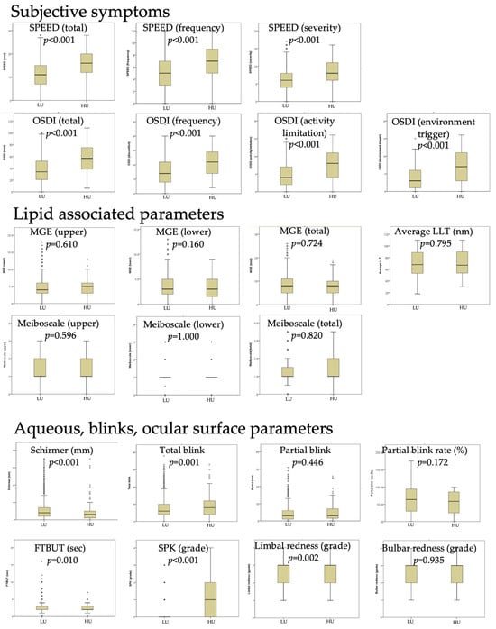 Comparison of baseline characteristics between high users (n = 180) and low users (n = 5414). LLT: average lipid layer thickness; MGE: number of expressible meibomian gland expression; FTBUT: fluorescein tear-film break-up time; SPK: superficial punctate keratitis. p: statistical significance examined by the Mann–Whitney U test. *: extreme outliers, more than three times the IQR away from the quartiles; 。: mild outliers, between 1.5 and 3 times the IQR away from the quartiles.