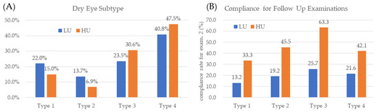 Distribution of dry eye subtypes of high users and low users. (A) There were significantly more Type 3 and 4 patients in the high-user group (chi-square p = 0.002). (B) The compliance rate was significantly higher in high users (chi-square test p < 0.001). LU: low user; HU: high user.