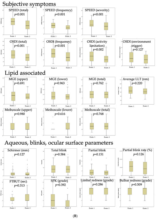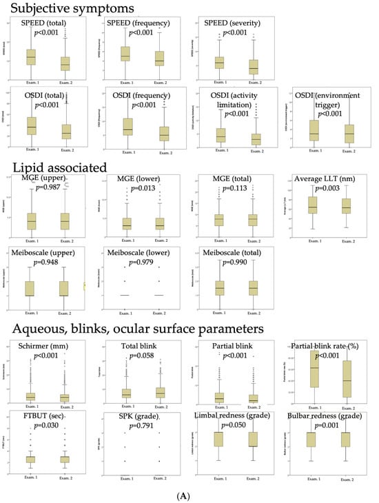 Subjective symptoms were evaluated via the Standardized Patient Evaluation of Eye Dryness (SPEED) and Ocular Surface Disease Index (OSDI) questionnaires. The frequency and severity score derived from the SPEED questionnaire, along with the three individual subtotal scores from the OSDI questionnaire (subtotal A: symptom frequency; subtotal B: activity limitation frequency; subtotal C: environmental trigger discomfort frequency), were analyzed.