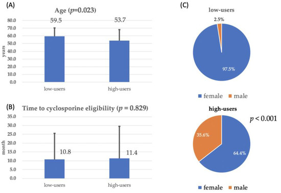 During the follow-up period, 1.1% of low users qualified for cyclosporine treatment under our national healthcare policy [28], compared to a significantly higher proportion of high users (15.4%, odds ratio: 16.4, p < 0.001). At the time of cyclosporine eligibility, high users were significantly younger (p = 0.023) and showed less pronounced female dominance (p < 0.001) (Figure 5). However, there was no significant difference in the time to cyclosporine eligibility between the two groups (p = 0.829).