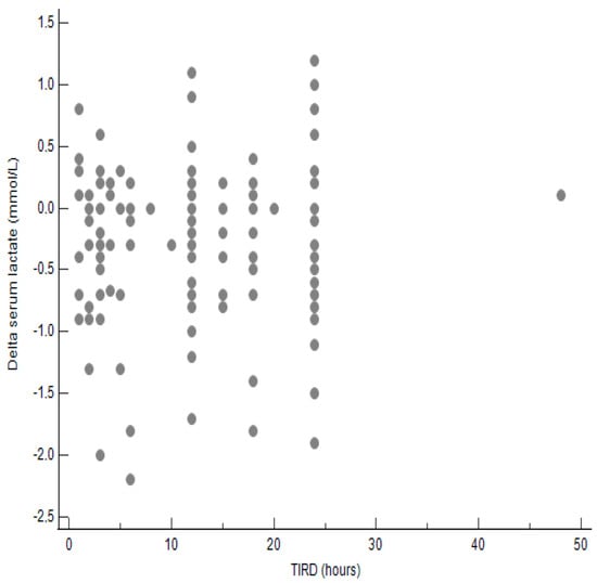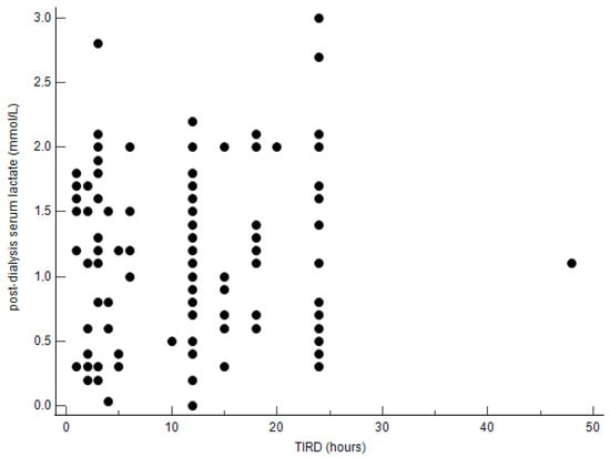 | Post-Dialysis Serum Lactate Levels | TIRD ≤ 12 h (n = 70) | TIRD > 12 h (n = 47) | p |