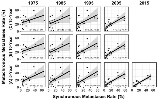 Regression analysis between the rates of synchronous metastases rate and metachronous metastases rate based on (A) 5-year, (B) 10-year, and (C) 15-year survival data from 1975 to 2015 (the data are missing for lung and bronchus cancer, and prostate cancer in 1975 and 1985, and the data are missing for larynx cancer in 2005 and 2015). Gray areas around the lines represent the standard error of the regression line.