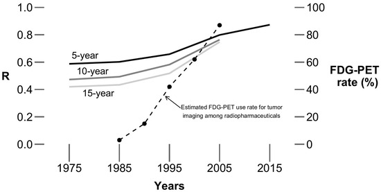 R values over time. Solid lines depict the change in R values (the data include all (18) cancer sites), estimated by 5-, 10-, and 15-year survival data, over time (from 1975 to 2015, by 10-year intervals). The dashed line indicates estimated FDG-PET use rate for tumor imaging among radiopharmaceuticals (from Drozdovitch et al.) [9]. The timing of the marked increases in the R values corresponds roughly to the timing of increases in the use of FDG-PET.