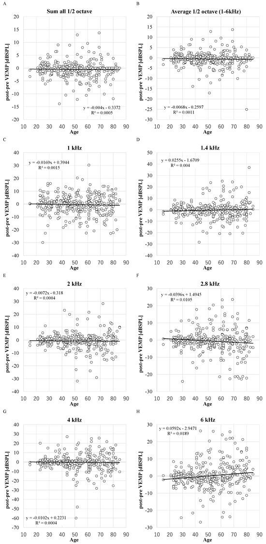 The distribution between DPOAE levels before VEMP testing and age. X-axis: ages in years. R2: the coefficient of determination. p-values of Pearson product moment correlation coefficient analysis: p < 0.0001 in all parameters. (n = 348 ears in 1, 1.4, 2, 2.8, 4, and 6 kHz and n = 298 in sum and average). (A): sum; (B): average; (C): 1 kHz; (D): 1.4 kHz; (E): 2 kHz; (F): 2.8 kHz; (G): 4 kHz; (H): 6 kHz.