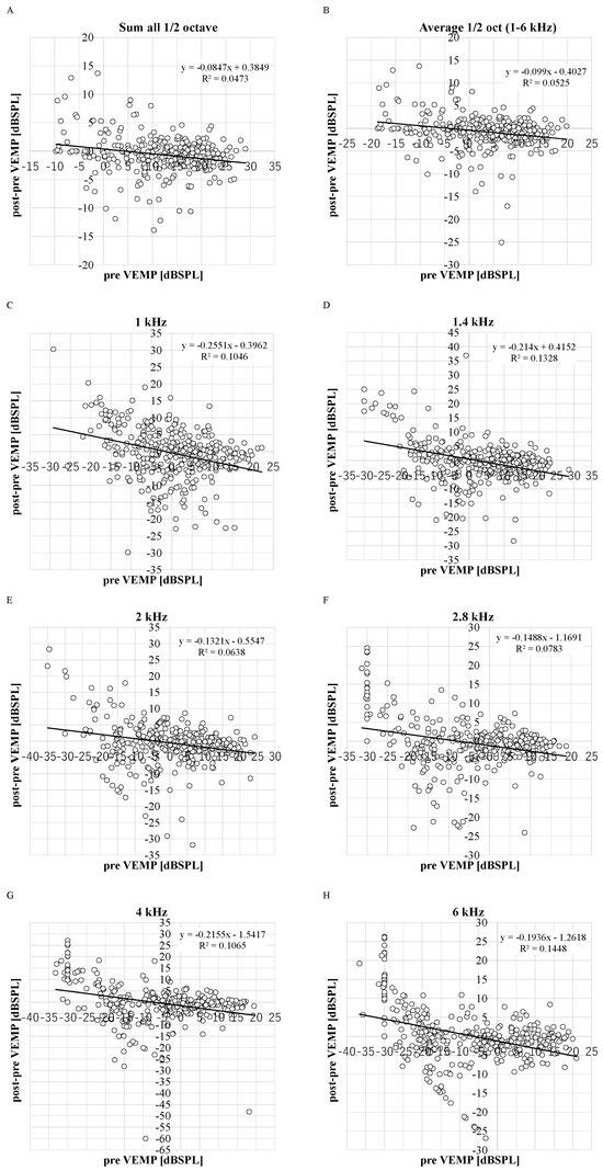 The distribution between decreased DPOAE levels and DPOAE levels before VEMP testing. R2: the coefficient of determination. p-values of Pearson product moment correlation coefficient analysis: p < 0.0001, p < 0.0001, p = 0.0015, p < 0.0001, p < 0.0001, p < 0.0001, p = 0.03, and p = 0.01 in 1, 1.4, 2, 2.8, 4, and 6 kHz, sum and average. (n = 348 ears in 1, 1.4, 2, 2.8, 4, and 6 kHz and n = 298 in sum and average). (A): sum; (B): average; (C): 1 kHz; (D): 1.4 kHz; (E): 2 kHz; (F): 2.8 kHz; (G): 4 kHz; (H): 6 kHz.