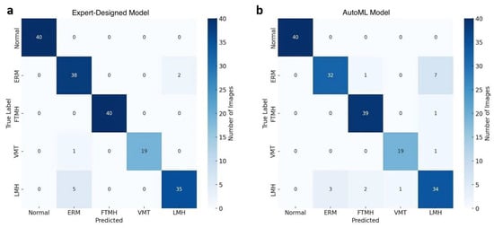 Confusion matrices comparing the performance of the expert-designed model (a) and the AutoML model (b) in classifying Normal and vitreomacular interface disorders on OCT images.