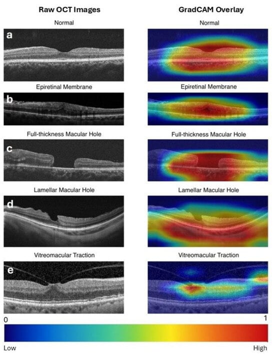 Grad-CAM generated a heatmap overlay on the original image by highlighting the most influential regions responsible for the model’s decisions, such as the macular hole region for FTMH and the vitreomacular attachment point for VMT. Representative Grad-CAM visualizations for each class are presented in Figure 3.