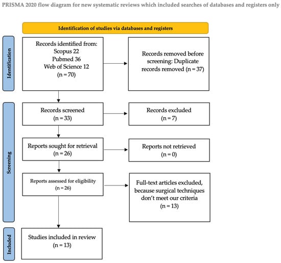 We identified 70 manuscripts; of these, 36 records were identified on PubMed, 12 were identified on Web of Science, and 22 were identified on Scopus. Records excluded for selection criteria and duplicates were n = 37. In our review, we included a total of 13 manuscripts and 27 patients at the end of the screening process (Table 1). The PRISMA flow diagram of the selection process is provided in Figure 1.