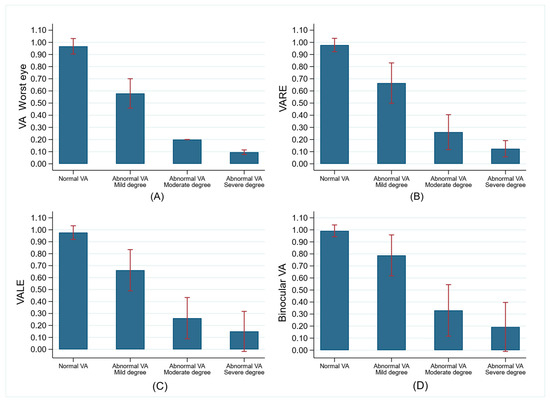 Comparison of monocular and binocular visual acuity (VA, mean and SD, and Snellen decimal notation) between children with normal (VA in worst eye > = 0.8, n = 1878) and abnormal VA (VA in worst eye < 0.8; n = 286). (A) Comparison of worst-eye VA between children with normal VA and those with mild, moderate, and severe VA impairment. (B) Comparison of VARE between children with normal VA and those with mild, moderate, and severe VA impairment. (C) Comparison of VALE between children with normal VA and those with mild, moderate, and severe VA impairment. (D) Comparison of binocular VA between children with normal VA and those with mild, moderate, and severe VA impairment.