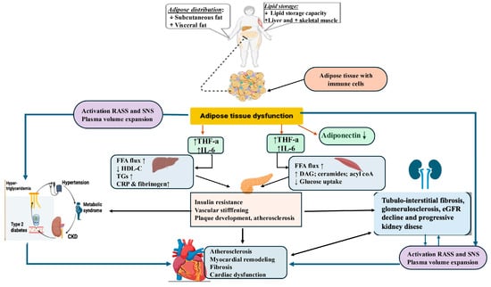 Obesity occurs when the energy intake consistently exceeds the caloric expenditure, leading to overmuch fat accumulation. Excess and dysfunction of adipose tissue, especially visceral fat, lead to increased infiltration of immune cells that secrete inflammatory and pro-oxidative molecules, such as cytokines (TNFα, IL-6) and free fatty acids (FFAs), which, when excessive, impair the function of insulin receptors and metabolic processes, leading to elevated glucose levels [35]. The released FFAs cause the liver to produce triglycerides and form very low density lipoproteins (VLDLs). This results in decreased levels of high-density lipoproteins (HDLs) and the appearance of small and dense low-density lipoprotein (LDL) particles, which are more atherogenic. Chronic inflammation, adipokine imbalance, and insulin resistance worsen this lipid profile, increasing the cardiovascular risk [36]. Obesity contributes to the development of hypertension through the activation of the sympathetic nervous system (SNS) and RAAS, a mechanism that induces endothelial dysfunction and reduces nitric oxide production. These pathophysiological changes lead to increased peripheral vascular resistance and heart rate, while the increased secretion of aldosterone promotes sodium retention, thus exacerbating hypertension. Furthermore, the chronic activation of the SNS and RAAS promotes the hypertrophy of smooth muscle cells in blood vessels, contributing to a further increase in blood pressure (BP) [37]. These mechanisms demonstrate the central role of obesity in the progression toward dyslipidemia, hypertension, and DM. Similarly, excess body weight is associated with obesity-related kidney disease (OKD), contributing to the onset or progression of CKD. The mechanisms involved include glomerulosclerosis, tubular inflammation, and renal fibrosis [38].
