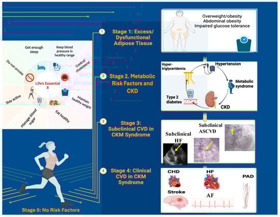 Stages of CKM syndrome, reflecting the pathophysiological progression and increased absolute risk of cardiovascular disease throughout the progression of this syndrome (adapted from [9], using images from personal collection). Stage 3 CKM Syndrome: yellow arrow shows, in the left image, a hypertrophied interventricular septum depicted in echocardiography, apical four-chamber view, as a marker of subclinical HF; in the middle image, yellow arrow shows left renal artery stenosis in renal angiography, as a marker of subclinical ASCVD; in the right image, yellow arrow shows a severe stenosis of the left main coronary artery in coronary angiography. Created with BioRender.com; accessed on 19 February 2025.