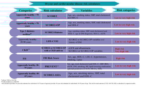 SCORE2 and SCORE2-OP risk assessment models now have CKD add-ons based on data from the Chronic Kidney Disease Prognosis Consortium, which improve CVD risk prediction beyond SCORE2 and SCORE2-OP. This approach will help clinicians and patients with CKD refine patient risk prediction and further personalize preventive therapies for CVDs [88]. The SCORE2-ASIA model was recently developed for the accurate prediction of the 10-year risk of CVD in apparently healthy people in Asian countries, thereby enhancing the identification of individuals at higher risk of developing CVDs across the Asia Pacific Region [89].