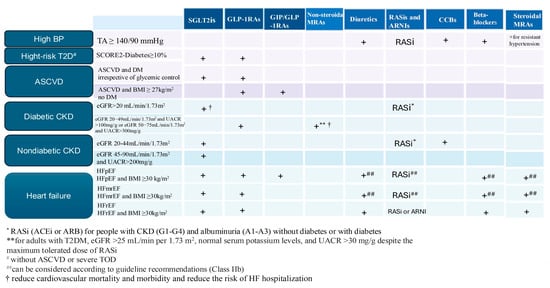 - Handelsman, Y.; Anderson, J.; Bakris, G.L.; Ballantyne, C.M.; Bhatt, D.L.; Bloomgarden, Z.T.; Bozkurt, B.; Budoff, M.J.; Butler, J.; Cherney, D.Z.I.; et al. DCRM 2.0: Multispecialty practice recommendations for the management of diabetes, cardiorenal, and metabolic diseases. Metabolism 2024, 159, 155931. [Google Scholar] [CrossRef] [PubMed]
