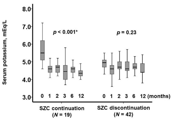Trajectory of serum potassium levels during one-year observation period. Serum potassium levels are shown for the SZC continuation group following SZC initiation and for the SZC discontinuation group following SZC cessation. * p < 0.05 by Friedman test.