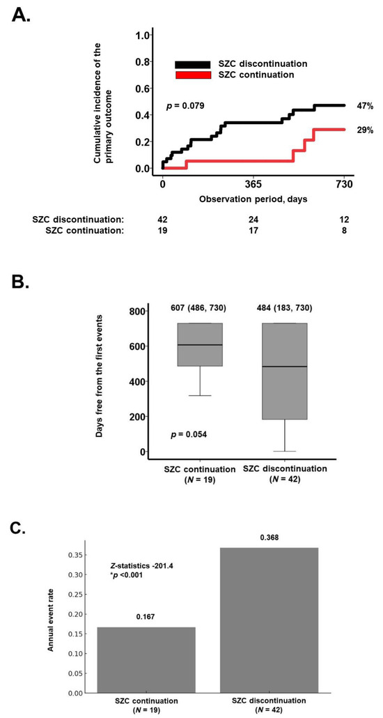 Two-year cumulative incidence of the primary outcome (A); days free from the first events (B); and the annual event rates (C). (A) Kaplan–Meier curves comparing the cumulative incidence of the primary outcome between the SZC continuation group and the SZC discontinuation group, analyzed using the log-rank test. (B) Comparison of days free from the first event between the two groups using the Mann–Whitney U test. (C) Comparison of annual event rates between the two groups using the two-sample Poisson rate comparison test. * p < 0.05.