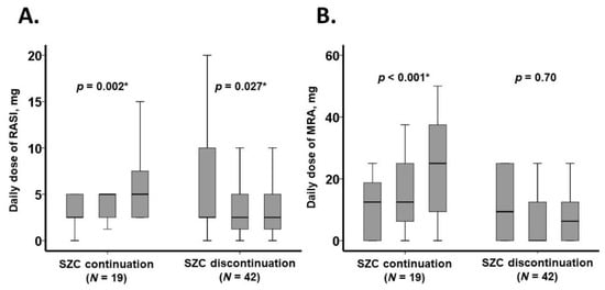 The trajectory of medication doses over the three-month observation period is presented in Figure 3 and Table 3. In the SZC continuation group, the daily doses of RAS inhibitors and MRAs increased significantly (p < 0.05 for both). Conversely, in the SZC discontinuation group, the daily dose of RAS inhibitors significantly decreased (p = 0.027), while the dose of MRAs remained unchanged (p = 0.70) (Figure 3).