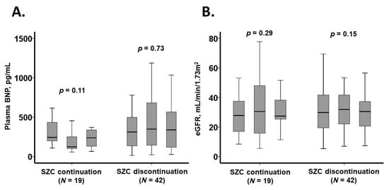 The trajectory of laboratory data over the three-month observation period is presented in Figure 4 and Table 6. In the SZC continuation group, plasma B-type natriuretic peptide levels showed a trend toward reduction (p = 0.11), whereas in the SZC discontinuation group, BNP levels remained unchanged (p = 0.73).
