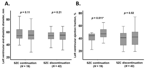 Key echocardiographic parameters over the three-month observation period are illustrated in Figure 5. Left ventricular end-diastolic diameter remained unchanged in both the SZC continuation and SZC discontinuation groups (p > 0.05 for both). However, left ventricular ejection fraction significantly improved in the SZC continuation group (p = 0.011), whereas no significant change was observed in the SZC discontinuation group (p = 0.52).