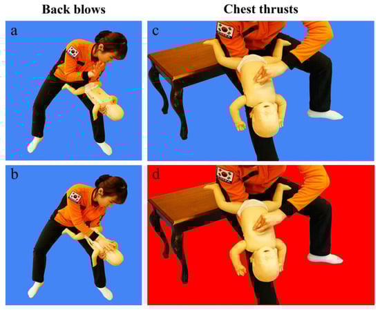 Small-packet animated graphics interchange formats (GIFs). The figure illustrates the sequential phases of the back blow (a,b) and chest thrust (c,d) maneuvers, respectively.