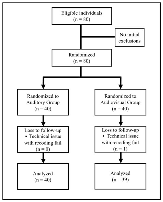 One participant in the audiovisual group was unable to be evaluated due to problems with the recorded video and was excluded from the study. Finally, the study included 40 and 39 participants in the auditory and audiovisual groups, respectively (Figure 2). In the auditory group, the mean age was 30.43 ± 3.11 years, there were 19 males, 15 participants had relevant training before, and the mean time since training was 4.88 ± 2.30 years. In the audiovisual group, the mean age was 30.46 ± 2.49 years, there were 13 males, 20 participants had relevant training before, and the mean time since training was 5.37 ± 2.41 years. There were no significant differences between the two groups in terms of sex, age, or prior training experience (Table 2).