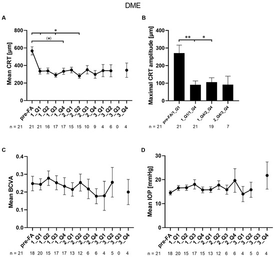 Changes in mean CRT, CRT amplitude, BCVA, and mean IOP in patients with DME: (A) mean CRT values are shown per quartile during a follow-up period of three years; (B) the absolute value of the maximum CRT amplitude was determined by calculating the difference between the lowest and highest CRT values within a specified period; (C) mean BCVA values are shown per quartile during a follow-up period of three years; (D) mean IOP values are shown per quartile during a follow-up period of three years. Pre-FA: value pre-FA implantation; x_Qy: quartile y of year x; n: number of eyes. Data are shown as mean ± SEM; ** p < 0.01; * p < 0.05; (*) p < 0.06 by trend.