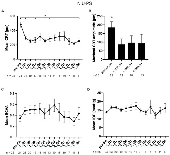 Changes in mean CRT, CRT amplitude, BCVA, and mean IOP in patients with NIU-PS: (A) mean CRT values of patients with NIU-PS are shown per quartile during a follow-up period of three years; (B) the absolute maximum value of the maximal CRT amplitude of patients with NIU-PS was calculated using the lowest and the highest CRT values within a certain period; (C) mean BCVA values are shown per quartile during a follow-up period of three years; (D) mean IOP values are shown per quartile during a follow-up period of three years. Pre-FA: value pre-FA implantation; x_Qy: quartile y of year x; n: number of eyes. Data are shown as mean ± SEM; * p < 0.05.