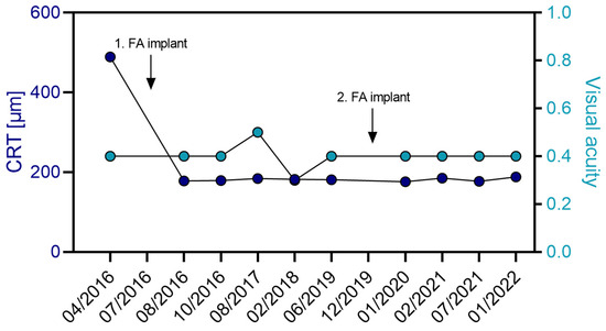 Progression of CRT (µm) and visual acuity in OS of patient A with DME over a follow-up period of 5.75 years. The patient received her first FA implant in July 2016 and the second FA implant 35 months later in December 2019. No additional treatments were necessary for the management of the macular edema. Arrows indicate time point of FA implant injection.