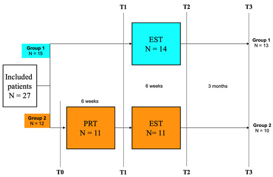 To assess the specific effect of the EST, all patients were randomly assigned to either of two groups (see Figure 1): Group 1 started at T1 with EST for 6 weeks and performed only one training method. Group 2 performed two training methods, one after the other: They started at T0 with a reading training program as a placebo training (PRT) in regard to EST. After using PRT for 6 weeks, these patients started training with the EST program at T1 for another 6 weeks.