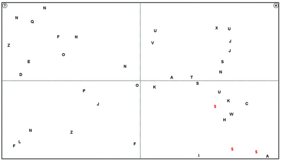 Screen shot of EST during a training session of middle level. The three “$” in the inferior right quadrant were correctly found letters by the patient. The separation into four quadrants were not shown during the training and served only for statistical analysis.