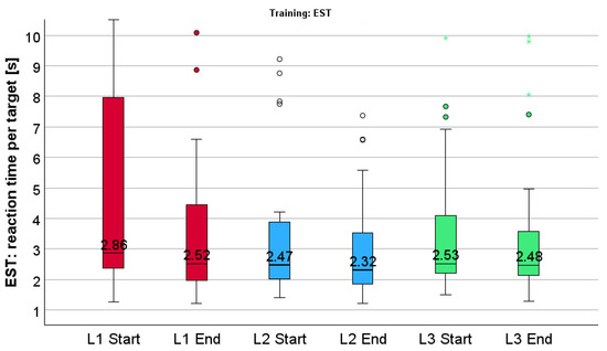 Reaction time (RT) during explorative saccadic training (EST) for all patients—level 1 (red), level 2 (blue), level 3 (green) at start and end—significant improvement on each level of difficulty. Mild outliers are depicted as circles (1.5–3.0 × IQR from the quartiles), extreme outliers as asterisks (>3.0 × IQR), following SPSS conventions.