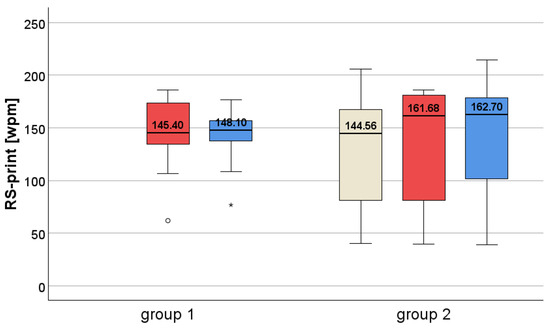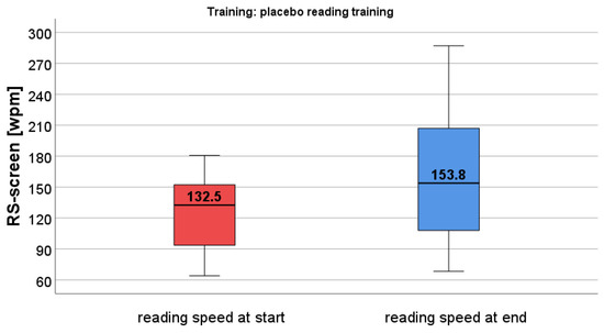 Reading speed during reading printed texts (RS-print) was reduced at baseline, which was also reported in other studies [8,9,44,45,46]. The RSVP method has been found to be beneficial in our previous studies in patients with central scotoma [13,14], as well as in studies by other authors [12]. After the placebo reading training (PRT), the patients of group 2 showed significant improvement of reading speed on the screen (RS-screen) by 21.3 wpm. Reading speed of printed text (RS-print) improved by 17.12 wpm, which was not statistically significant, but which we consider clinically relevant. Furthermore, the patients of group 2 reached normal RS values at T2, which would be explained by a “consolidation” of the effects of PRT between T1 and T2 and the transfer to everyday life. The high positive correlation between RS-screen and RS-print confirms the positive training effect and shows the transfer of the learned strategy to the real-world reading situation. Therefore, reading training can be recommended for patients with reduced RS.