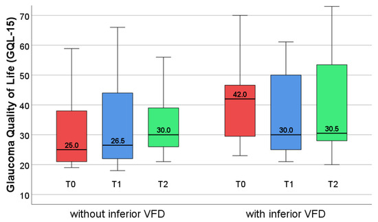 The GQL-15 questionnaire focuses only on the physical effects of glaucoma [25] and does not test the subjective well-being of patients, such as anxiety and depression [49]. For determination of patients’ psychological status, specific questionnaires can be used, as we did in our previous studies with patients with age-related macular degeneration in order to assess the effect of visual rehabilitation [13,32]. However, during the study design phase, we decided to favour the GQL-15 because it had been specially developed for patients with glaucoma [50] and because of its better compatibility with the daily routine in an ophthalmologists’ office.