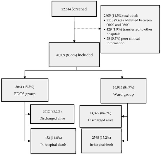 The final analysis was performed on a sample of 20,009 patients by comparing two groups: the first group included patients admitted before midnight (Ward group), while the second group included patients admitted after 8:00, who had spent at least one night in the emergency room (EDOS group) (Figure 1). All patients were followed up for 30 days.