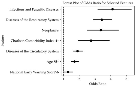 The forest plot of the selected variables entered into the logistic model for predicting mortality. Data are presented as odds ratios (OR) with 95% confidence intervals (95% CI); a p-value < 0.05 was considered significant. Variables are listed in order of importance from high to low.