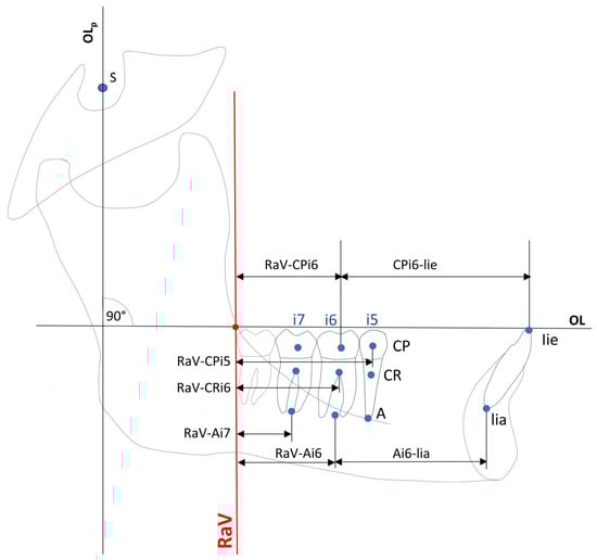 Construction of sagittal dental variables. Abbreviations: CP = dental centroid point; CR = dental center of resistance; A = dental apex point; i5/i6/i7 = second premolar, second and first molars; lie = lower incisor edge; lia = lower incisor apex; OLp = perpendicular line to occlusion line through sella of the Panscherz analysis; OL = occlusion line; RaV = anterior ramus vertical; RaV–CPi5/i6/i7 = sagittal distances between RaV and centroid point of second premolar, second and first molars; RaV–Cri5/i6/i7 = sagittal distances between RaV and center of resistance points of second premolar, second and first molars; RaV–Ai5/i6/i7 = sagittal distances between RaV and apex points of second premolar, second and first molars; CPi6–lie = sagittal distance between dental centroid point and RaV and upper incisor edge; Ai6–lia = sagittal distances between dental apex point i6 and lower incisor apex.
