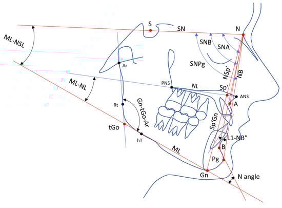 - Skeletal angles: SNB, ANB, SNPg, ML–NSL, ML–NL, Gn–tGo–Ar, and Norderval angle;