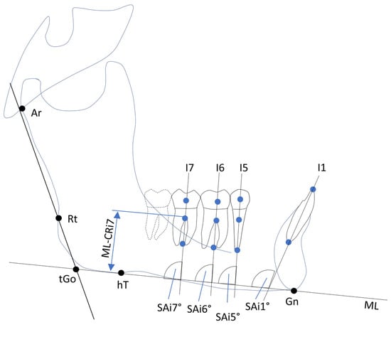 Construction of vertical dental variables and teeth inclinations. Abbreviations: i1/i5/i6/i7 = lower incisor, second premolar, second and first molars; Ar = articulare; Rt = caudal construction point of ramus line; hT = construction point of mandibular line; tGo = angle between ramus line and mandibular line; Gn = gnathion; ML = mandibular line; ML–Cri1/i5/i6/i7 = vertical distance between mandibular line and centers of resistance of lower incisor, second premolar, first and second molars; SAi1/i5/i6/i7 = inclination of lower incisor, second premolar, first and second molars to mandibular line.