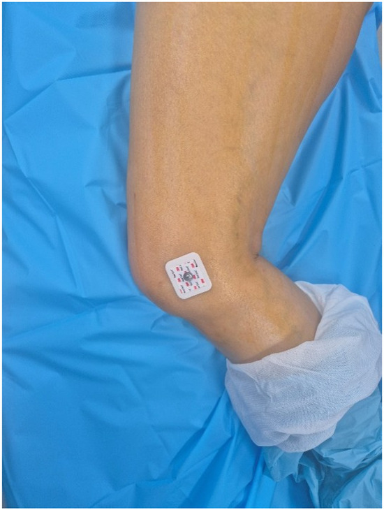 In practice, the lateral femoral condyle is used as a landmark in revision total knee arthroplasty to restore the joint line 2.5 cm below the lateral femoral epicondyle after removing the femoral implant. In primary TKA, the lateral femoral epicondyle is known to be a more prominent and easily identifiable structure than the medial epicondyle along the transepicondylar axis, which is used to determine femoral external rotation [11]. In the posterior-lateral approach to THA, the patient is positioned laterally, aligning the lateral femoral epicondyle with the extension of the surgical incision. But compared to the infrapatella landmark, the lateral epicondyle can be vague among obese patients or confused with osteophytes with degenerative osteoarthritic change around the knee. If the patient had a distal femoral osteotomy, the landmark of the lateral epicondyle can also be problematic. It suggests that the lateral epicondyle landmark can be an alternative option, not a routine technique. When the EKG lead is attached to this site (Figure 4), it is easier to orient the Mako probe toward the Mako monitor for position input compared to when the EKG lead is attached below the patella (Figure 5).