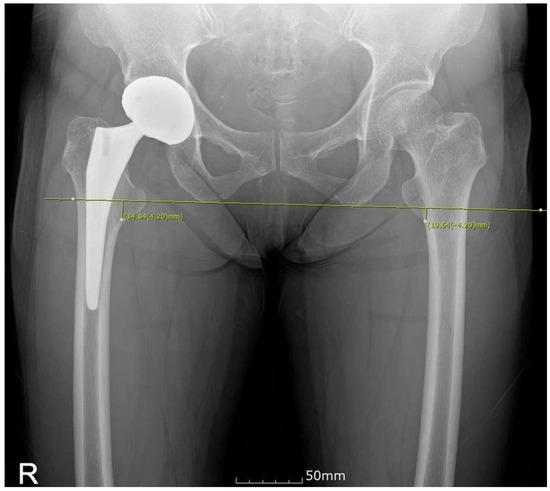 - Meermans, G.; Malik, A.; Witt, J.; Haddad, F. Preoperative radiographic assessment of limb-length discrepancy in total hip arthroplasty. Clin. Orthop. Relat. Res. 2011, 469, 1677–1682. [Google Scholar] [CrossRef] [PubMed]