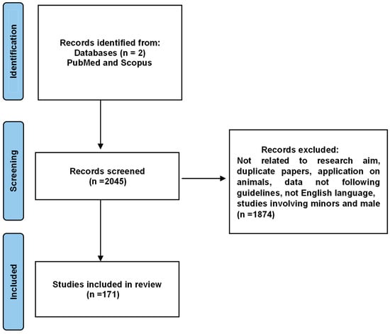 We performed a narrative review of the available scientific literature using the major databases PubMed and Scopus, focusing on studies published within the last 10 years. The keywords used included “microbiome infertility”, “microbiome fertility”, and “microbiome IVF”. After applying these search terms and narrowing the results to publications from the past decade, 2045 papers were identified. Subsequent filtering by the criteria “English language articles”, “human species”, “female sex”, and “adult (19+ years)” yielded 171 articles. Data from these studies were collected, and a manual search of the references within the selected articles was also performed (Figure 1).
