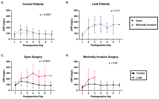 APA StyleNiemann, B. R., Murthy, J., Breinholt, C., Swords, J., Stevens, A., Garland-Kledzik, M., Mayers, K., Groves, E., Train, K., & Murken, D. (2025). Postoperative C-Reactive Protein Trend Is a More Accurate Predictor of Anastomotic Leak than Absolute Values Alone. Journal of Clinical Medicine, 14(9), 2931. https://doi.org/10.3390/jcm14092931