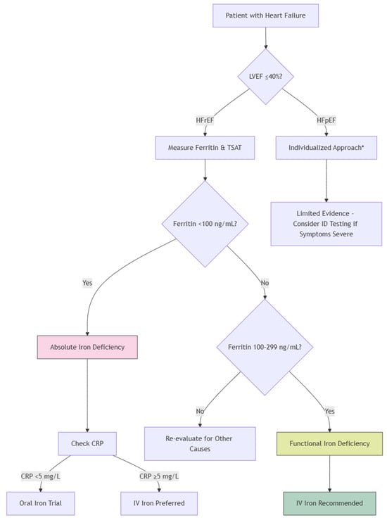 Diagnostic Algorithm for Iron Deficiency in Heart Failure. * Individualized Approach: The decision to proceed with iron testing and supplementation should consider the patient’s overall clinical condition, comorbidities, symptom severity, and other relevant factors. This approach ensures that treatment is tailored to the specific needs and circumstances of each patient.