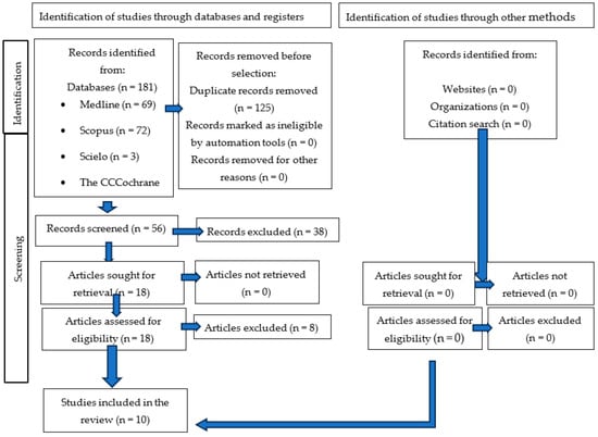 The results of the study selection are shown in Figure 1. Through an exhaustive search of databases, a total of 181 references were found, of which 69 corresponded to Medline PubMed, 72 to SCOPUS, 3 to Scielo, and 37 to The Cochrane Library. Next, 125 duplicate articles were discarded using the bibliographic manager Mendeley, so the title and abstract of 56 articles were analyzed. After an initial screening of 56 articles by title and abstract, 38 were excluded for not meeting the inclusion criteria, such as focusing solely on systemic symptoms of MS or lacking oral health data. The remaining 18 articles were read in full, with an additional 8 studies excluded due to reasons including incomplete outcome reporting (n = 3), a lack of comparison groups (n = 2), duplicate datasets (n = 2), and irrelevance to oral manifestations (n = 1) [20]. The final 10 studies included in this review are those that fulfilled all selection criteria and provided detailed data on oral manifestations in MS patients.