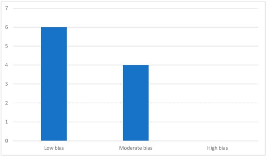 The results of the quality analysis based on the NOS and JBI guidelines are referenced in Table 4 and Table 5, respectively. According to the analysis, 4 out of the 10 articles were classified as having a moderate risk of bias, while the remaining 6 were considered to have a low risk of bias. None of the studies were evaluated as high risk. A visual summary of the risk of bias distribution is shown in Figure 2.