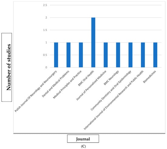 With regard to the year of publication, an increase in the number of articles over time can be observed, with a trend toward more recent publications (Figure 3A). No articles were published in the years 2017, 2018, and 2022 but, in contrast, a total of three articles were published in the year 2024. In terms of the country of publication, Poland and Iran were the most represented, each contributing multiple studies, while the remaining countries had only one publication each (Figure 3B). Finally, an analysis of the journals in which the articles appeared reveals a wide range of sources, with ‘BMC Oral Health’ being the most prominent, publishing two of the included studies (Figure 3C).