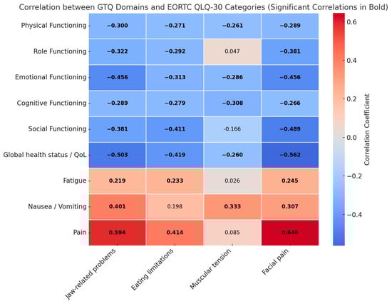 Construct validity was evaluated by analyzing the correlations between the domains of the I-GTQ2 and the domains of the EORTC QLQ C30. Spearman correlation coefficients revealed several strong associations, particularly highlighting the alignment between trismus-related problems and the physical and functional impacts on patients’ quality of life. For the EORTC C30, the instrument demonstrated moderate to strong statistically significant correlations in the majority of cases (31 out of 36), as shown in Figure 1.