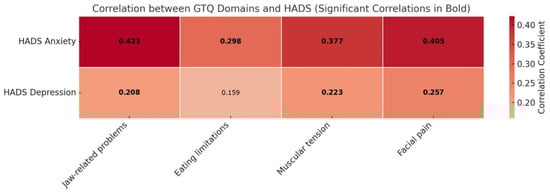 Notable strong correlations included a negative association between jaw-related problems and facial pain with global health status/QOL (rho = −0.504, p < 0.001 and rho = −0.562, p < 0.001, respectively), as expected. Conversely, as anticipated, there were strong positive correlations between jaw-related problems and facial pain with the pain domain (rho = 0.594, p < 0.001 and rho = 0.646, p < 0.001, respectively). The construct validity of the I-GTQ2 was further assessed by analyzing its correlations with the HADS, as shown in Figure 2.