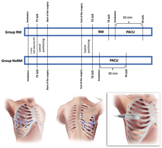 Schematics of intraoperative follow-up and transversal scanning lung ultrasound for six different lung zones. RM: recruitment maneuver; LUS: Lung Ultrasound Score; PACU: Post-Anesthesia Care Unit.